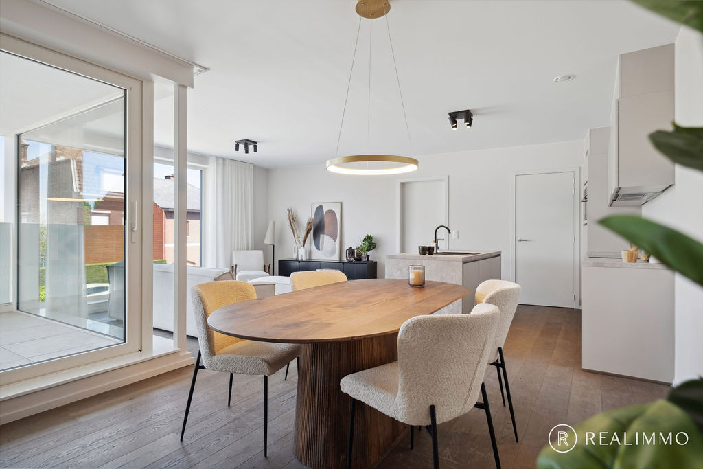 Indeling: Inkomhal met apart toilet, lichtrijke leefruimte met open keuken een een heel ruim overdekt terras (17,5m²), ruime berging, 2 slaapkamers en een badkamer.